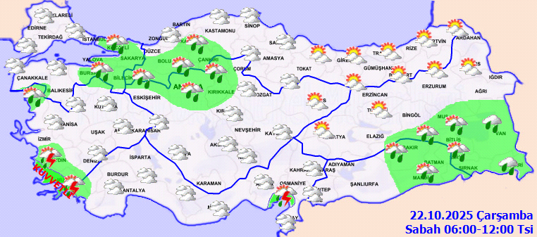 Çok bulutlu, bölge genelinin aralıklı sağanak ve gök gürültülü sağanak yağışlı geçeceği tahmin ediliyor. Yağışların; Muğla çevrelerinde yerel kuvvetli olması bekleniyor.